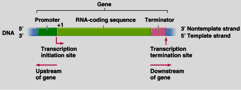 编码链、模板链、转录单元、上游/下游、启动子、增强子、RNA聚合酶