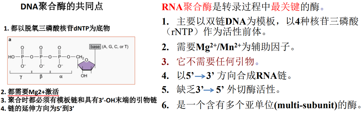 3. RNA产物不与模板链配对:在转录中DNA的解链是有限的和短暂的,只发生足够长度的链分离以便RNA聚合酶“阅读”DNA模板;而在复制过程中两条DNA母链永久性地分开。