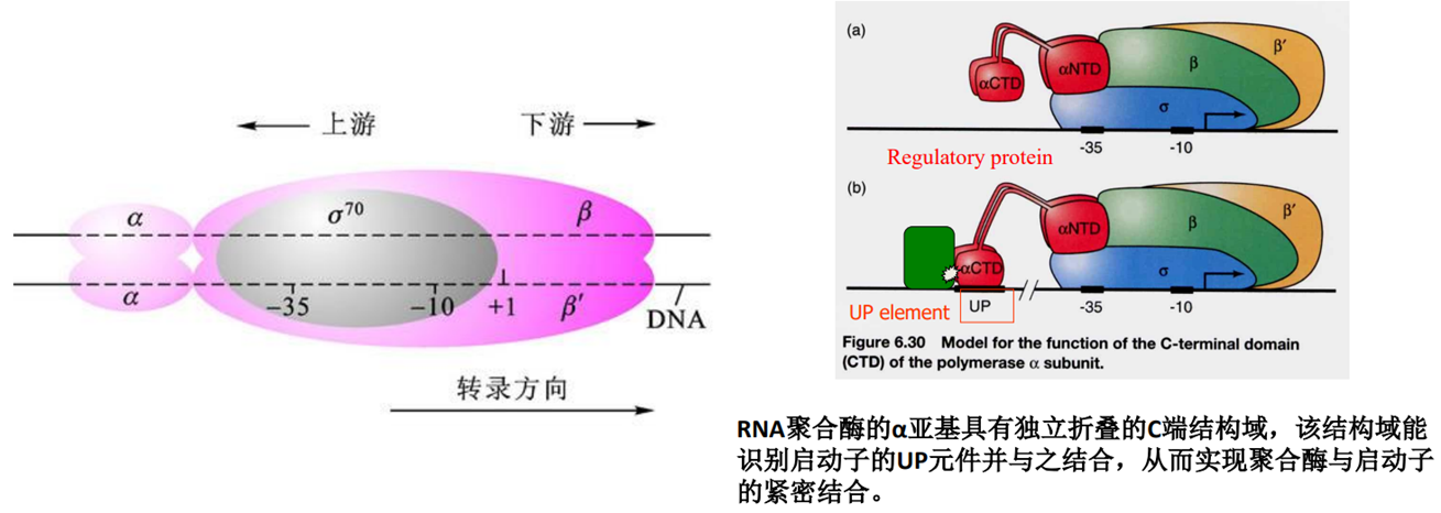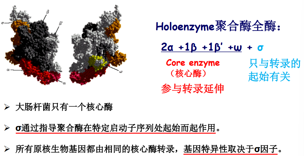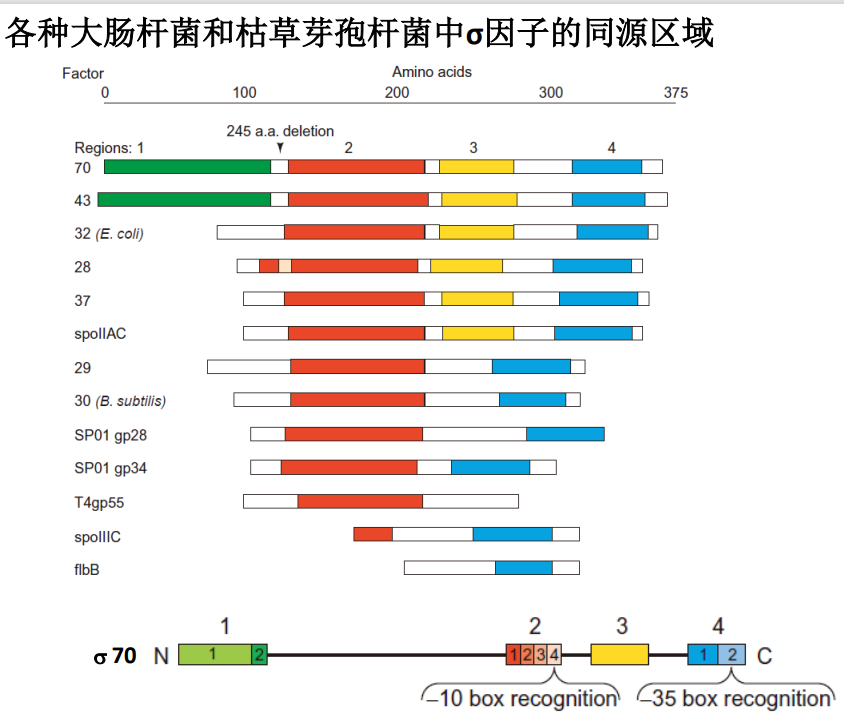 σ因子自身并不能与DNA结合,但与核心酶相互作用后暴露出σ因子的DNA结合域:β’亚基的氨基酸片段促进sigma因子与启动子-10框的非模板链的结合;因子可以选择哪些基因将被转录