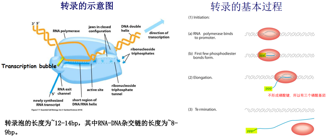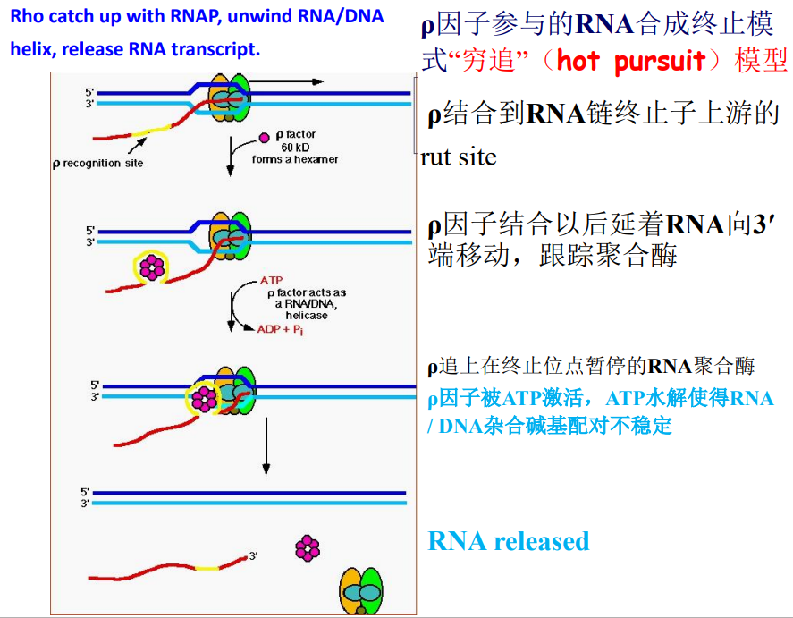 当RNA链延伸到转录终止位点时,RNA polymerase 和RNA链均从DNA模板上释放出来。