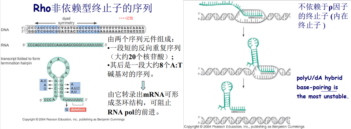 1. 只含有自我互补区域,可形成茎环结构,但在茎中的G.C含量少,茎环易打开。其终止需要 ρ 因子的参与。
