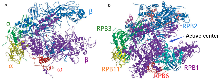 Comparison of the crystal structures of prokaryotic and eukaryotic RNA polymerases. (a) Structure of RNA polymerase core enzyme from Thermus aquaticus; (b) Structure of RNA Pol II from yeast Saccharomyces cerevisiae.