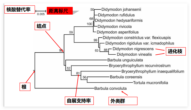 无根树:只是指明了种属的相互关系,没有确认共同祖先或进化途径。即反映分类单元之间的距离而不涉及谁是谁的祖先问题。