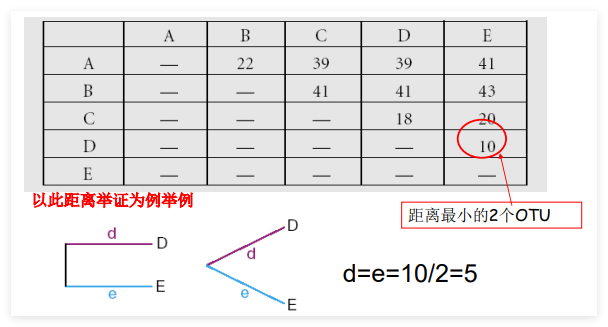 首先将距离最小的2个OTU聚在一起,其分支结点位于2个OTU间距离的1/2处,并形成一个新的OUT。