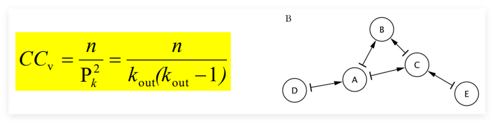 在有向网络中,由于两个节点间可以存在两条方向相反的边,则标准化的聚类系数被定义为:
