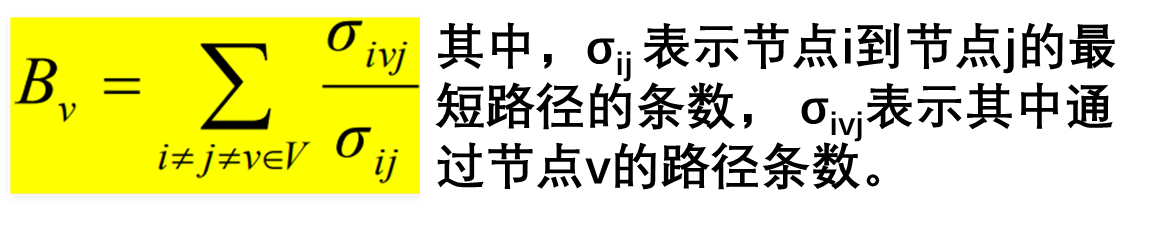 一个节点的介数(betweenness)是衡量这个节点出现在其它节点间最短路径中的比例。节点v的介数Bv定义如下: